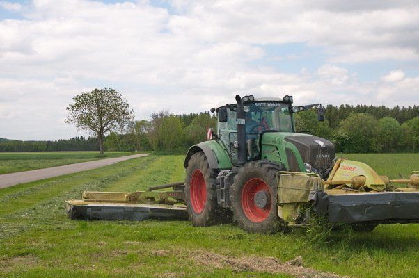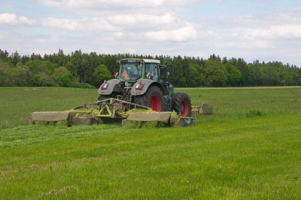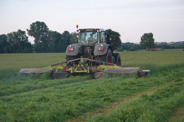 Zum Gras mähen verwenden wir eine Front-/Heckkombination mit 8,5m Arbeitsbreite.