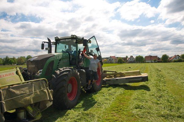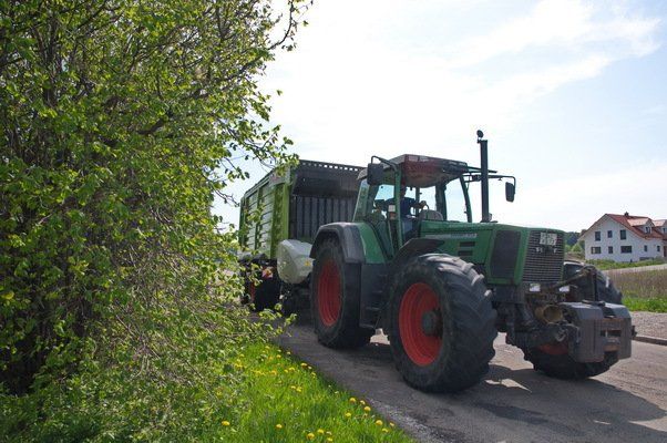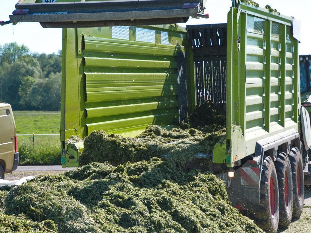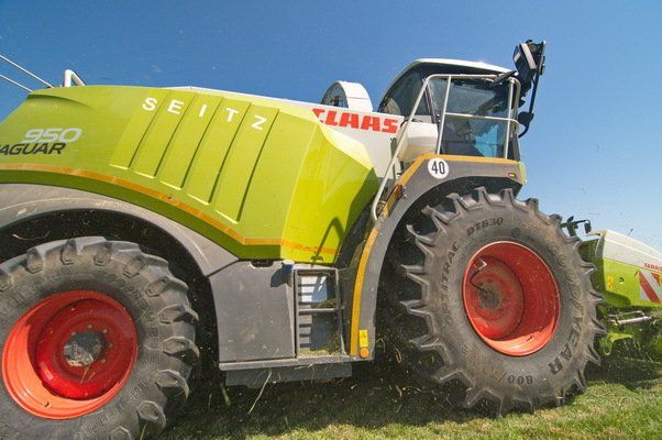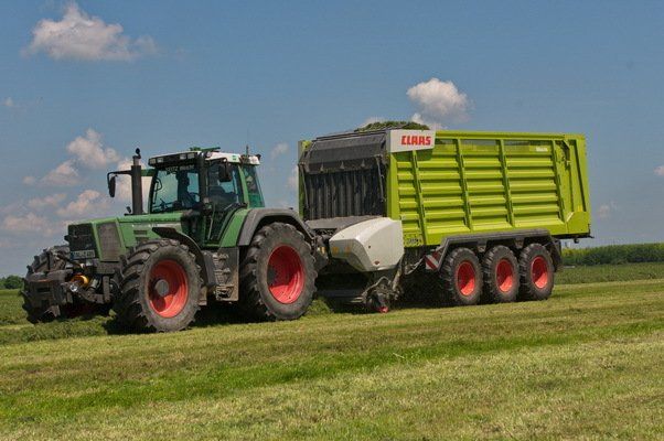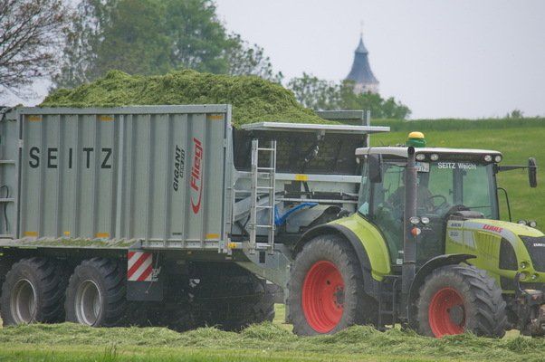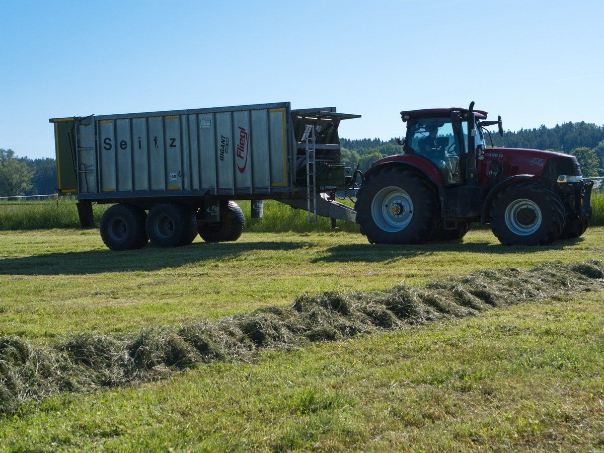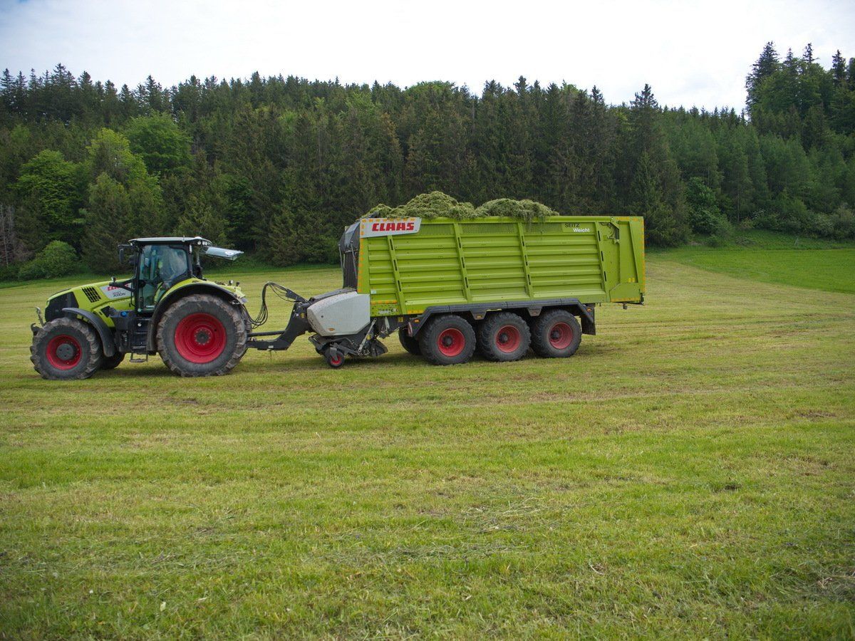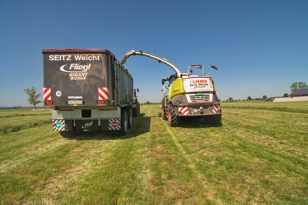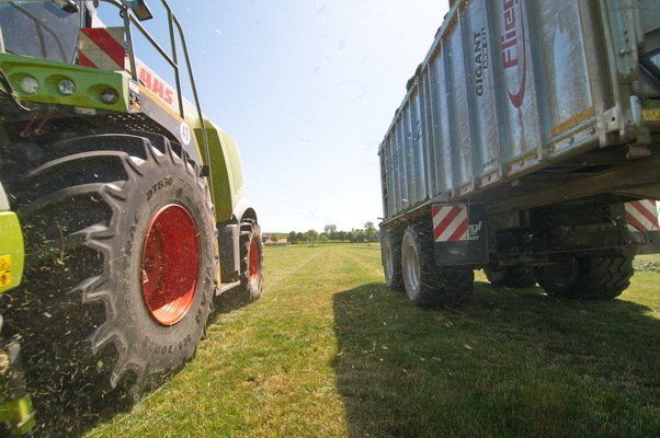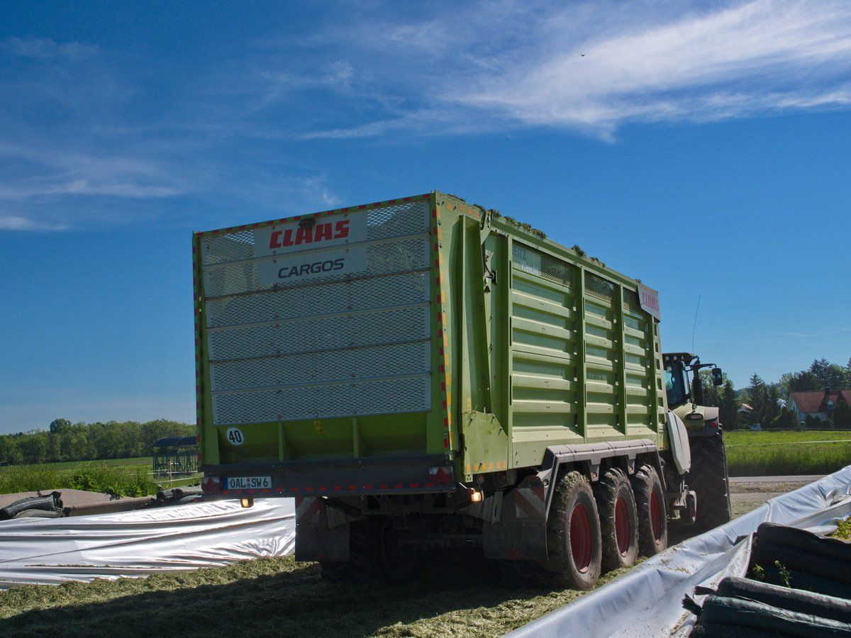 Zur überbetrieblichen Grassilage setzen wir zwei Silierwagen ein. Ausgestattet sind diese mit einer breiten Pick-Up, 40-Messer Schneidwerk, Kratzboden-Schnellentleerung, großvolumiger Bereifung, Lenkachse